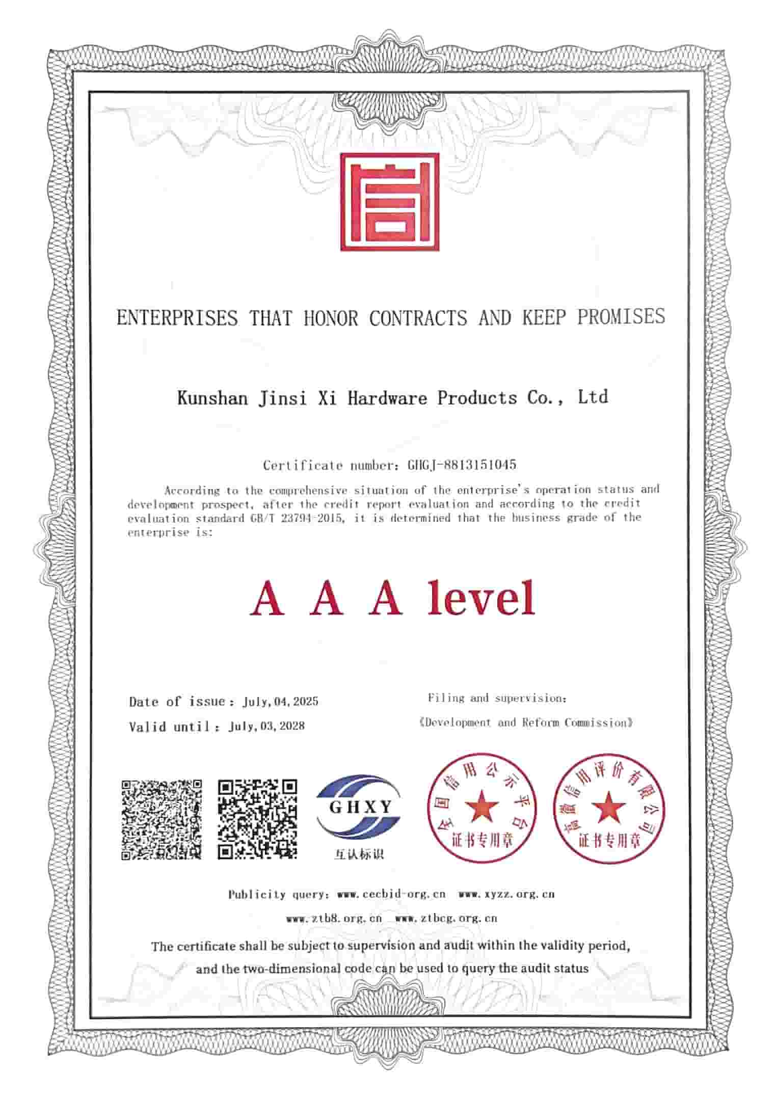 कुशानJINSIXIमेटलवेयर कंपनी लिमिटेड को आधिकारिक तौर पर "एएए स्तर के उद्यम जो अनुबंधों का सम्मान करते हैं और वादे निभाते हैं" की उपाधि से सम्मानित किया गया है। JINSIXI हमेशा "एकता और सहयोग, परिश्रम, उत्कृष्टता और पूर्णता की खोज", ईमानदारी के साथ काम करना, ग्राहकों को उच्च गुणवत्ता वाली सेवाएं प्रदान करना और अंततः "पूर्ण पूर्ति" प्राप्त करना के व्यापार दर्शन का पालन करता रहा है।